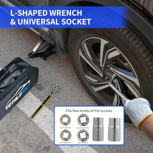Complete 15-piece roadside emergency kit with 2-ton scissor jack and lug wrench. Perfect for quick tire changes on cars, trucks, and SUVs. Compact, durable design ensures you’re always prepared for flat tire emergencies.