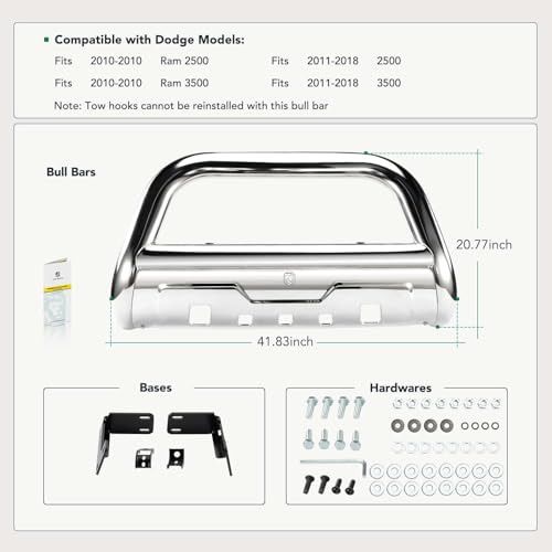Enhance the rugged appeal and functionality of your Dodge Ram 2500 or Ram 3500 with the YHTAUTO 3.5″ Bull Bar Push Bar. Designed for models from 2010 to 2018, this stainless steel 304 brush guard transforms your truck’s front bumper into a formidable force, perfect for off-road adventures and everyday durability.