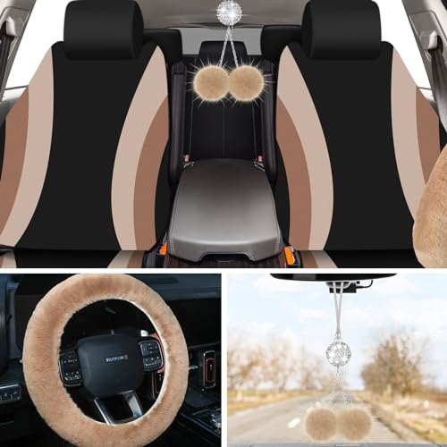 ROCEEI 43Pc Fuzzy Car Seat Cover Set Women Fluffy Steering Wheel Beige Black
