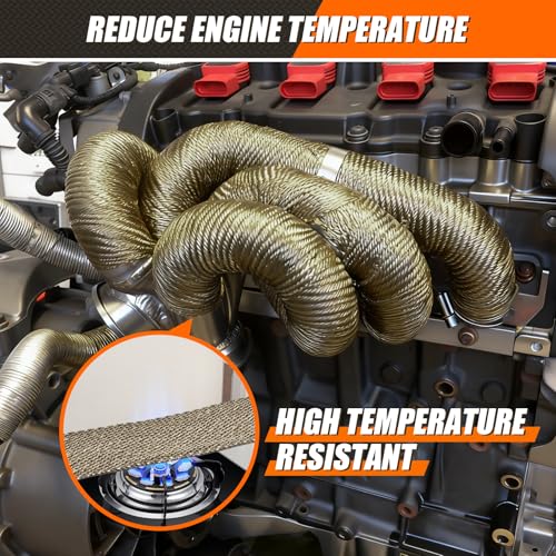 PREMIUM MATERIAL: The exhaust header wrap is made of the finest basalt fiberglass which resist to both to both extreme high and low temperatures. With its high end material, the muffler wrap could withstands 1800°F direct or 2500°F intermittent heat.