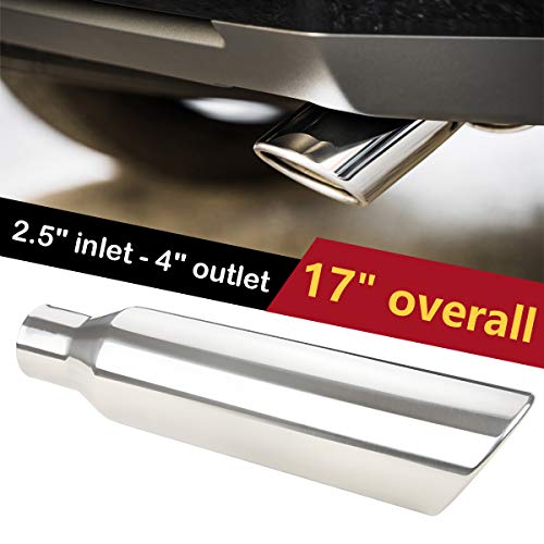 Upgrade your diesel’s style and performance with these sleek, polished stainless steel exhaust tips. 2.5″ inlet, 4″ outlet, 17″ length provides a bold, custom look and improved exhaust flow for your vehicle.