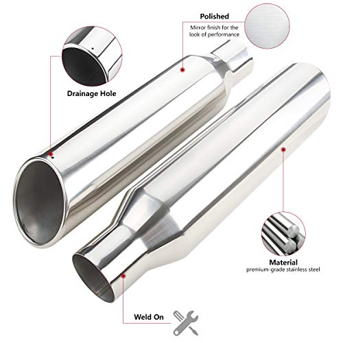 These universal stainless steel exhaust tips are more than just a cosmetic upgrade – they’re a statement of automotive excellence. Featuring a 2.5″ inlet that expands to a 4″ outlet and measuring 17″ in overall length, these tips are engineered to deliver maximum exhaust flow and an aggressive, head-turning look.