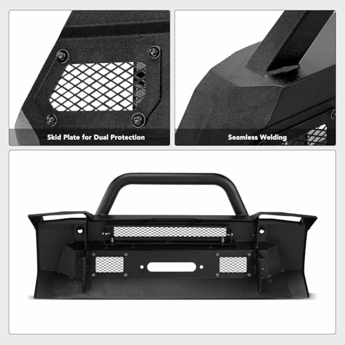 The YHTAUTO Bull Bar Push Bar with Skid Plate for the Toyota Tundra 2022-2023 is designed to enhance both the aesthetic appeal and functionality of your truck. Constructed from heavy-duty steel, its robust design is not just for show—it offers real protection for the front of your vehicle. With its rugged textured black finish, this accessory adds to the off-road look while ensuring durability and strength.