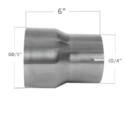 Premium T304 stainless steel exhaust adapter with flared design. Reduces 4" ID to 5" OD, 6" length. Polished finish resists corrosion. Universal fit for seamless exhaust connections.