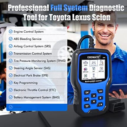 Unlock comprehensive diagnostics for Toyota, Lexus, and Scion with the OBDMATE 9360. This full-system OBD2 scanner reads and clears engine, ABS, SRS, and TPMS codes, resets batteries, and more. User-friendly and compatible, it’s the perfect tool for accurate troubleshooting and efficient vehicle maintenance.