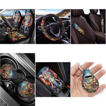 Boho Elephant Car Seat Covers Set: 12pc Floral Interior Accessories Kit